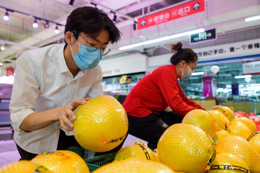 在滿(mǎn)洲里市慶客隆超市,工作人員在整理水果。新華社記者 李志鵬 攝