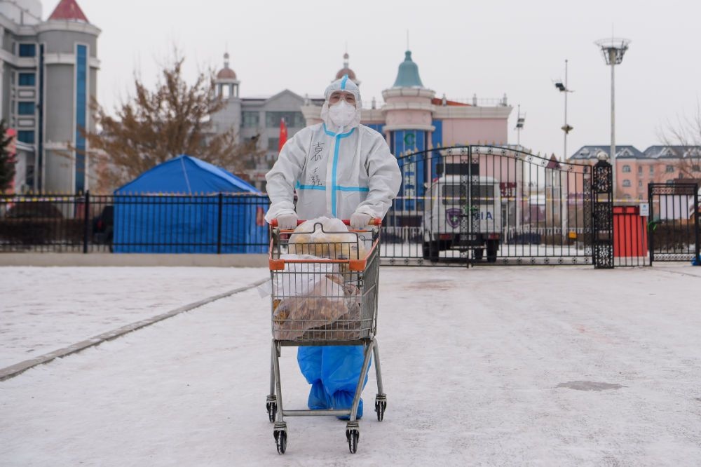 在滿(mǎn)洲里市府欣小區(qū),工作人員運(yùn)送物資。新華社記者 李志鵬 攝