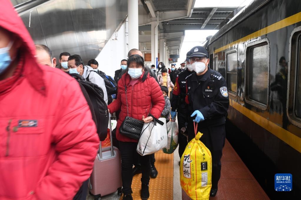 在湛江開往南寧的列車外,南寧鐵路公安局南寧公安處乘警支隊(duì)民警張洪手執(zhí)喇叭引導(dǎo)旅客有序上車(2月19日攝)。新華社記者 陸波岸 攝