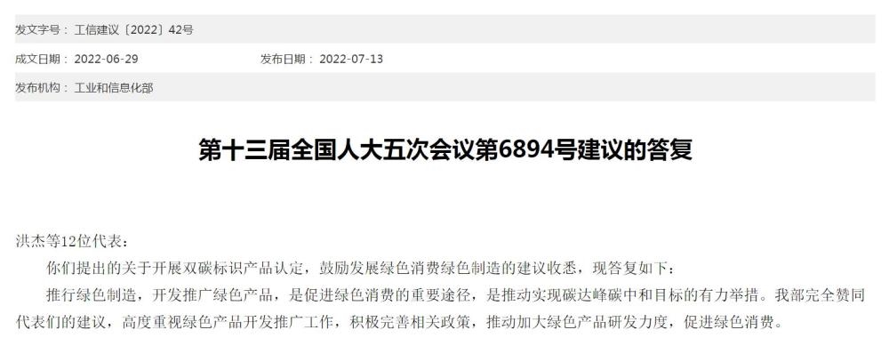 在答復中,工信部表示,推行綠色制造,開發(fā)推廣綠色產品,是促進綠色消費的重要途徑,是推動實現(xiàn)碳達峰碳中和目標的有力舉措。工信部完全贊同代表們的建議,高度重視綠色產品開發(fā)推廣工作,積極完善相關政策,推動加大綠色產品研發(fā)力度,促進綠色消費。