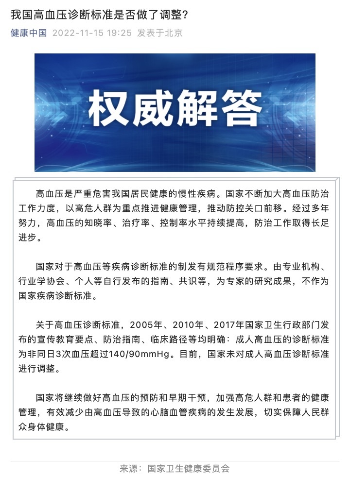 關(guān)于高血壓診斷標(biāo)準(zhǔn),2005年、2010年、2017年國(guó)家衛(wèi)生行政部門發(fā)布的宣傳教育要點(diǎn)、防治指南、臨床路徑等均明確:成人高血壓的診斷標(biāo)準(zhǔn)為非同日3次血壓超過140/90mmHg。目前,國(guó)家未對(duì)成人高血壓診斷標(biāo)準(zhǔn)進(jìn)行調(diào)整。