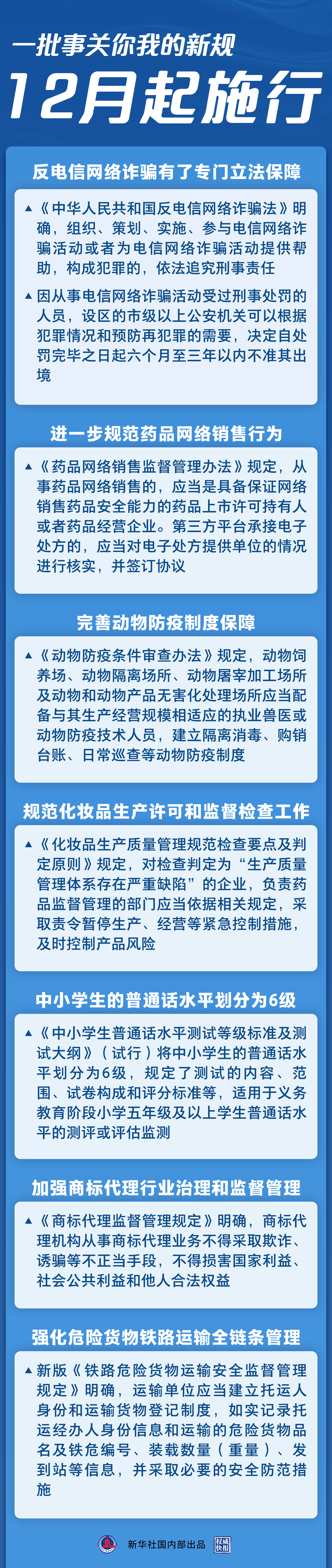 2022年的最后一個(gè)月,一批事關(guān)你我的新規(guī)開始施行。反電信網(wǎng)絡(luò)詐騙有了專門立法保障,中小學(xué)生的普通話水平有了規(guī)范標(biāo)準(zhǔn),藥品網(wǎng)絡(luò)銷售平臺責(zé)任進(jìn)一步壓實(shí)……法治,為美好生活助力。