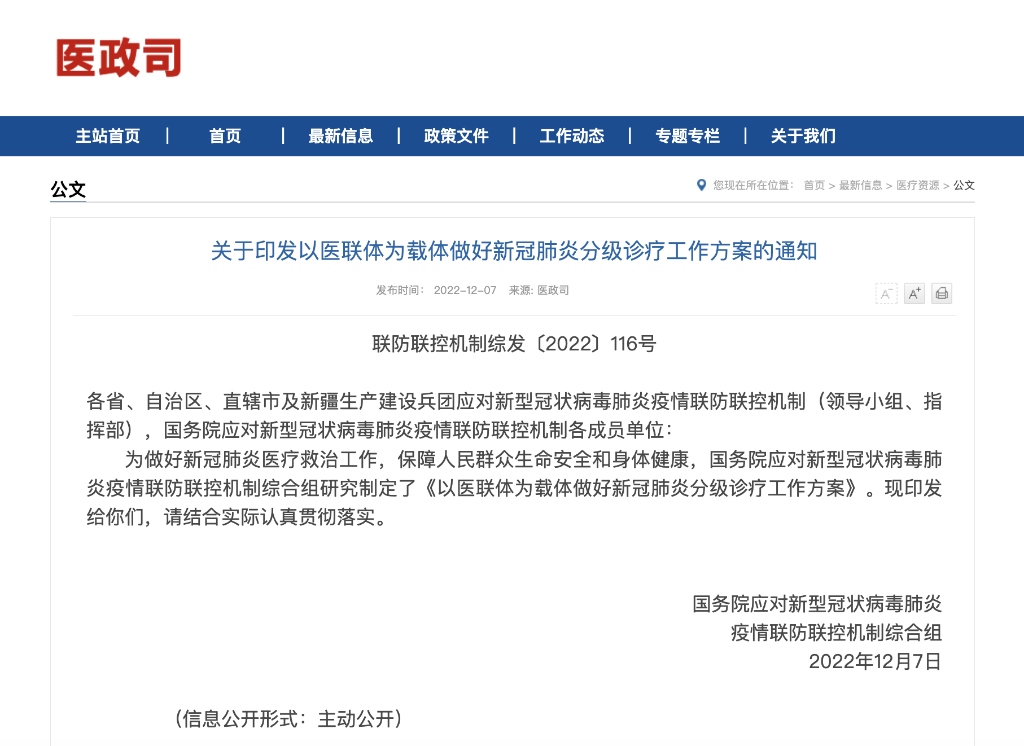 新華社北京12月7日電 為做好新冠肺炎醫(yī)療救治工作,全力保障高齡合并基礎(chǔ)疾病等重癥風(fēng)險(xiǎn)較高的感染者及時(shí)救治,構(gòu)建更加科學(xué)有序的就醫(yī)秩序,國務(wù)院聯(lián)防聯(lián)控機(jī)制綜合組12月7日發(fā)布《以醫(yī)聯(lián)體為載體做好新冠肺炎分級診療工作方案》。