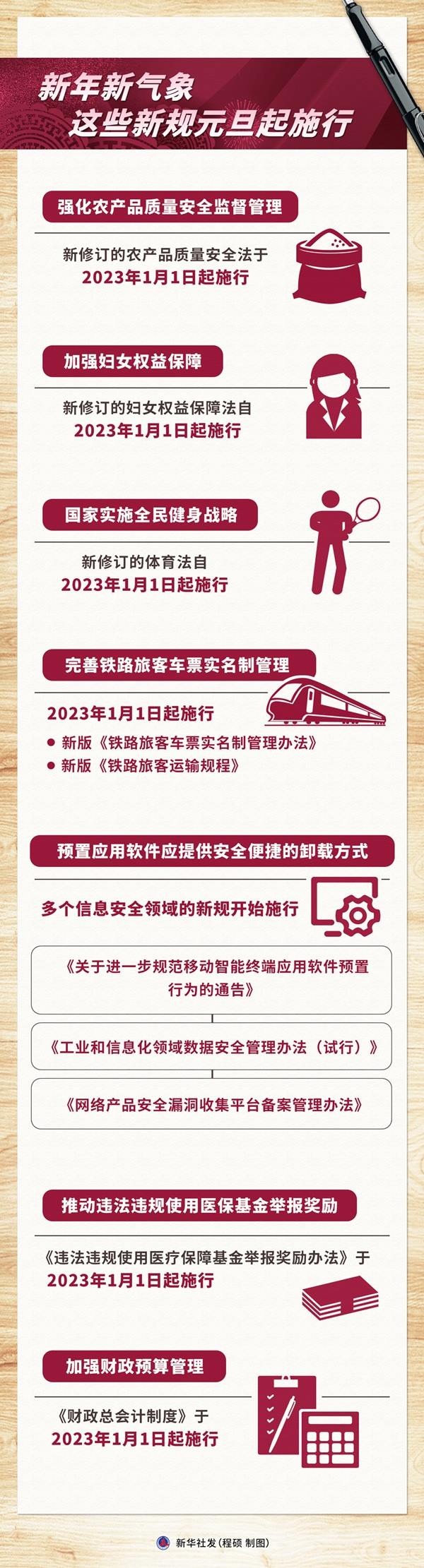 當2023年的鐘聲敲響,一批元旦起施行的新規(guī),將為我們帶來新年新氣象。新修訂的農(nóng)產(chǎn)品質量安全法全鏈條保障“舌尖上的安全”;新修訂的婦女權益保障法進一步促進男女平等;新修訂的體育法構建全民健身公共服務體系……法治的溫度,彰顯社會的進步。