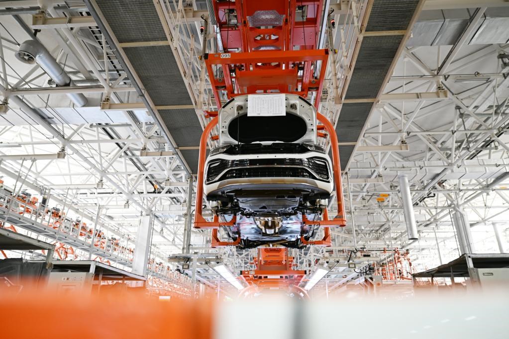 在天津經(jīng)濟技術(shù)開發(fā)區(qū)一汽-大眾華北基地,車輛在生產(chǎn)線上等待裝配零部件(2022年6月15日攝)。新華社記者 李然 攝