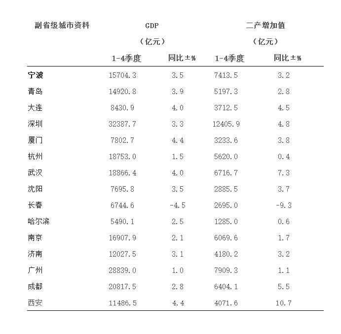 15座副省級城市中,經(jīng)濟增速“破4”的有西安(4.4%)、廈門(4.4%)、武漢(4.0%)和大連(4.0%),長春增速告負(fù),為-4.5%。