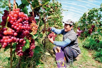 在山東省惠民縣胡集鎮(zhèn)惠臺葡萄專業(yè)合作社,村民在采摘葡萄(2022 年 9 月 24 日攝) 郭緒雷攝 / 本刊