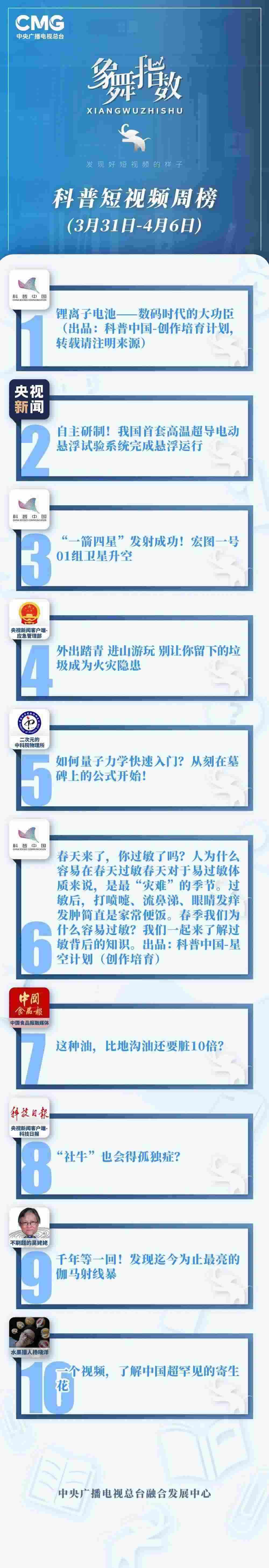 象舞指數(shù)|科普短視頻周榜(3月31日—4月6日)