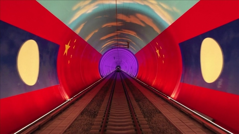 2023年4月9日,云南西雙版納,航拍中老鐵路友誼隧道,隧道內(nèi)各種燈光裝飾,隧道外墻畫展現(xiàn)文化特色。視覺中國
