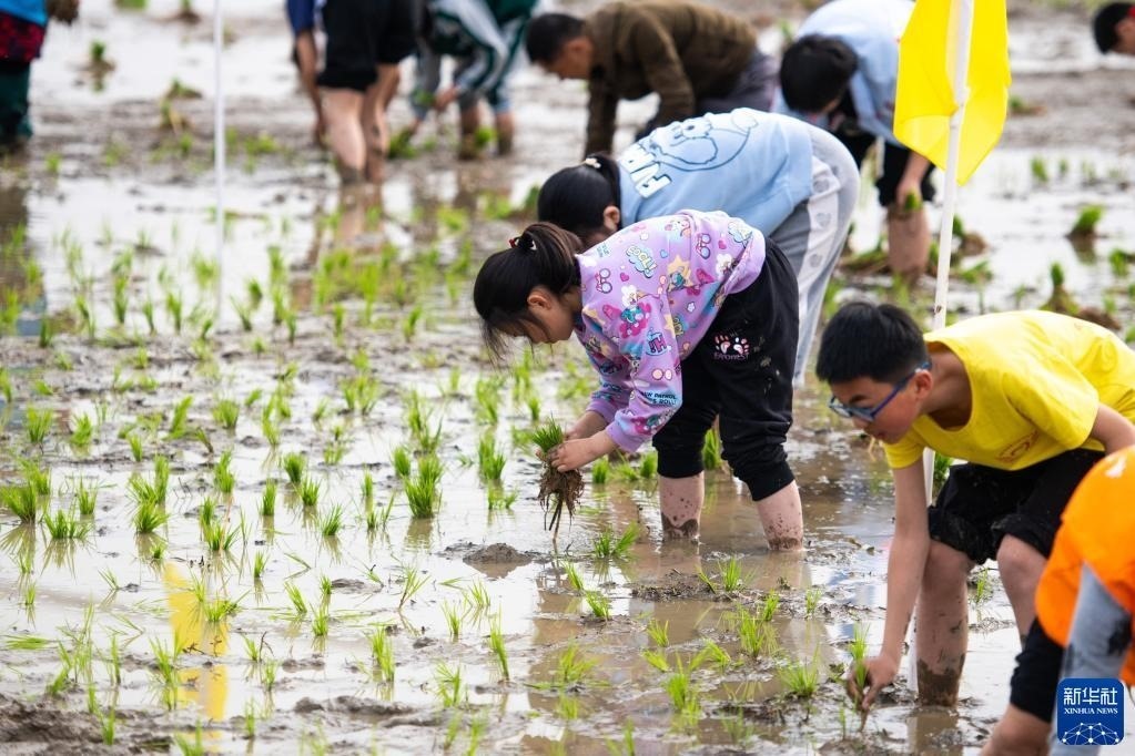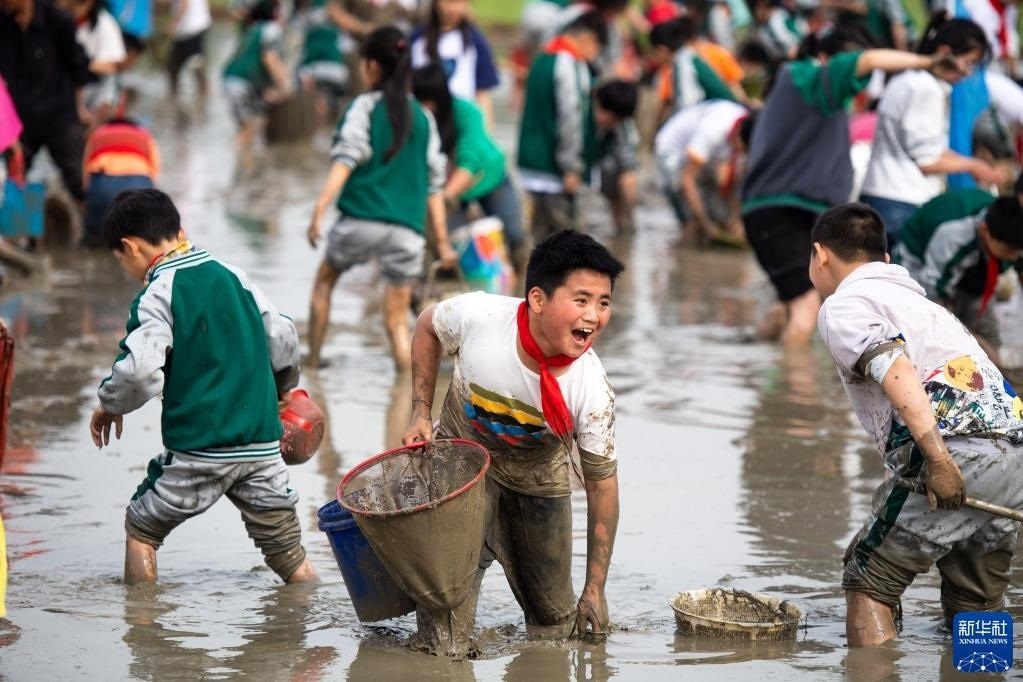 當日,在湖南省長沙市寧鄉(xiāng)市灰湯鎮(zhèn)花果山村舉行的農耕民俗文化節(jié)學生研學活動中,孩子們通過開展稻田插秧、捉泥鰍等“農趣” 比賽,走進田間地頭,感受勞動帶來的艱辛與快樂。新華社記者 陳思汗 攝