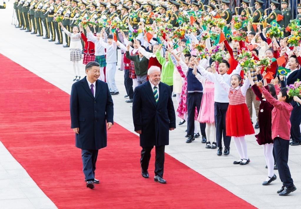 4月14日下午,國(guó)家主席習(xí)近平在北京人民大會(huì)堂同來(lái)華進(jìn)行國(guó)事訪問(wèn)的巴西總統(tǒng)盧拉舉行會(huì)談。這是會(huì)談前,習(xí)近平在人民大會(huì)堂東門外廣場(chǎng)為盧拉舉行歡迎儀式。新華社記者 黃敬文 攝