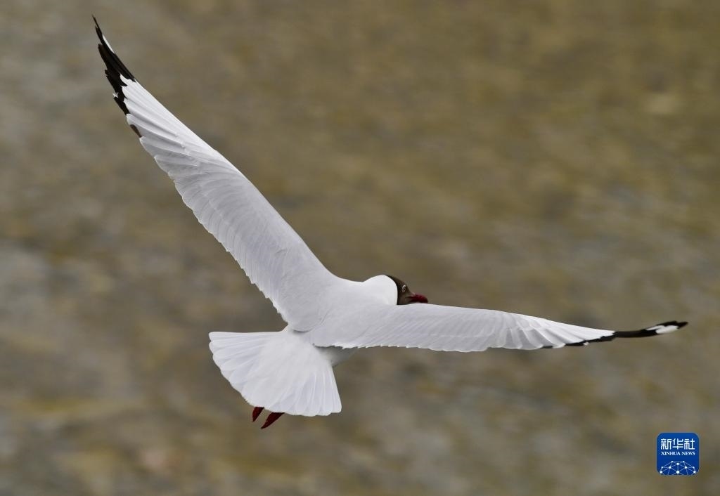棕頭鷗在拉薩河上空翱翔(4月16日攝)。