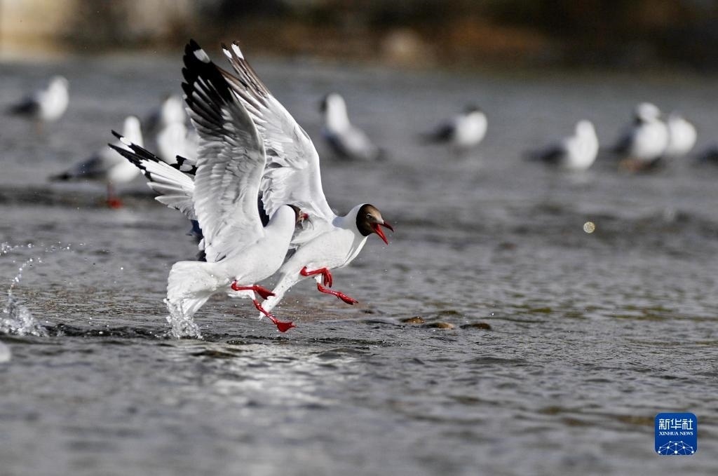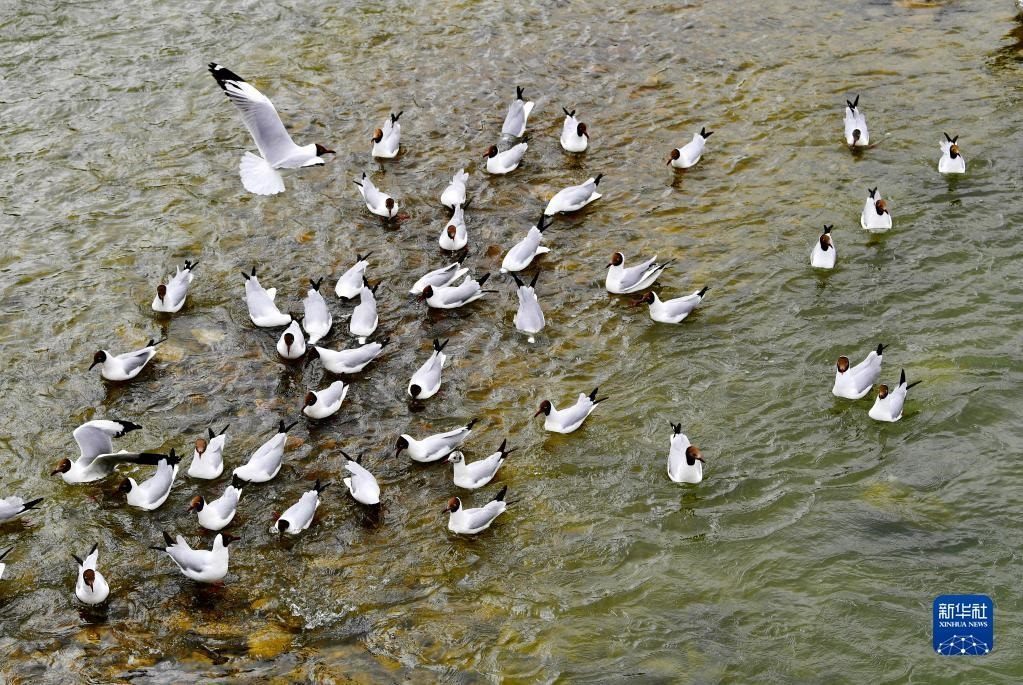 棕頭鷗在拉薩河上嬉戲(4月16日攝)。