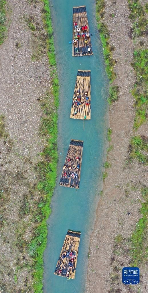 4月29日,游客在浙江省臺(tái)州市仙居縣永安溪體驗(yàn)生態(tài)竹筏漂流(無(wú)人機(jī)照片)。