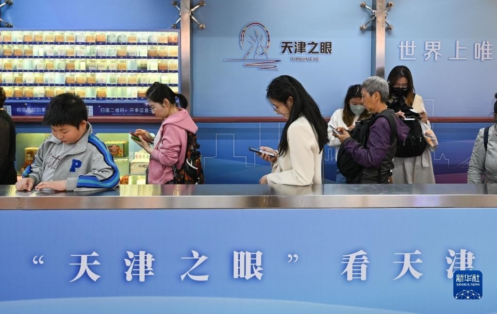 4月27日,游客在乘坐“天津之眼”摩天輪時觀看轎廂內新設置的天屏播放的文旅宣傳視頻。