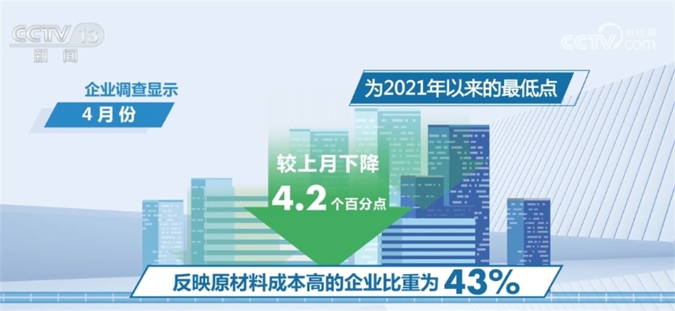 今年以來,原材料成本、物流和勞動力成本普遍回落。企業(yè)調(diào)查顯示,4月份反映原材料成本高的企業(yè)比重為43%,較上月下降4.2個百分點,為2021年以來的最低點。反映物流成本高和勞動力成本高的企業(yè)比重分別為27.5%和30%,較上月下降1.9和1.1個百分點。