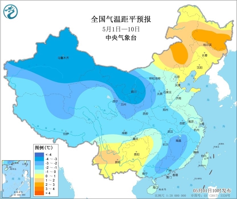 未來(lái)10天,除內(nèi)蒙古中東部、東北地區(qū)及云貴高原平均氣溫較常年同期偏高1℃左右外,全國(guó)其余大部分地區(qū)平均氣溫較常年同期偏低1~2℃,其中新疆、甘肅、內(nèi)蒙古西部等地的部分地區(qū)偏低3℃以上。