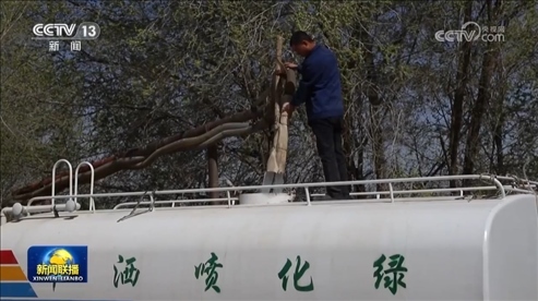 在甘肅八步沙林場,曾經寸草不生的沙漠被嫩綠的沙生植物所覆蓋。眼下,林場職工正抓住時機,為今年新栽的樹苗澆“安苗水”。