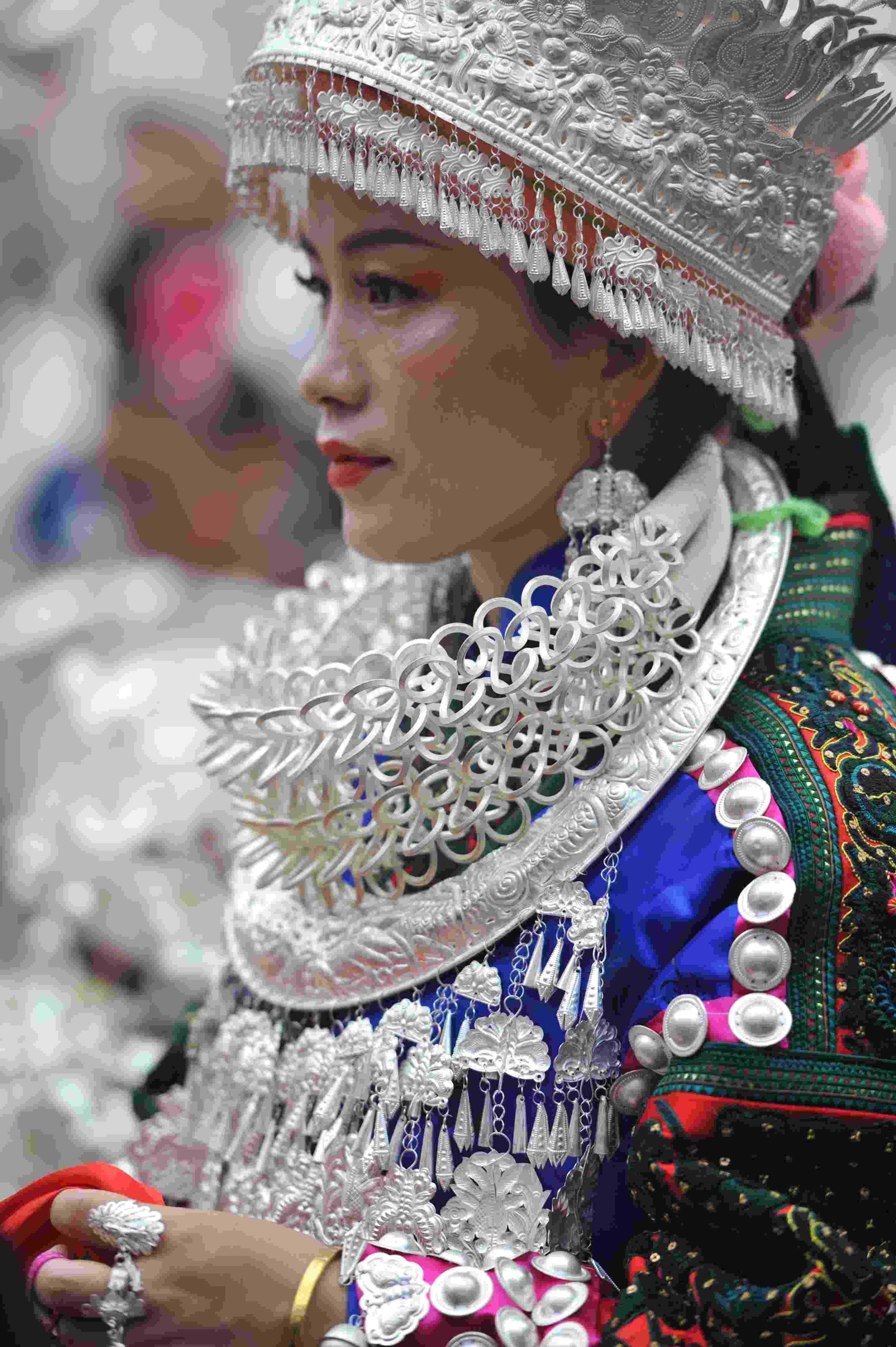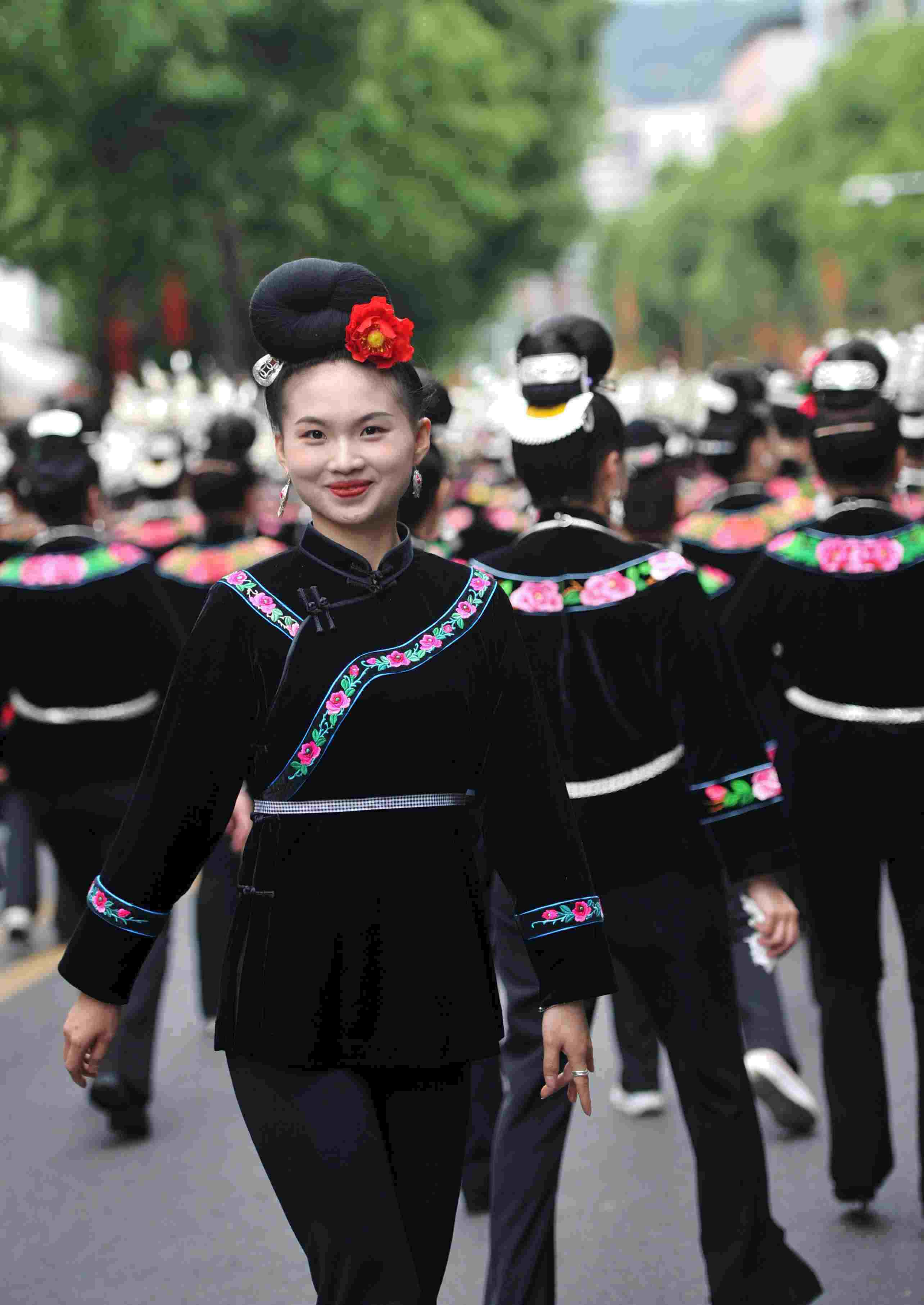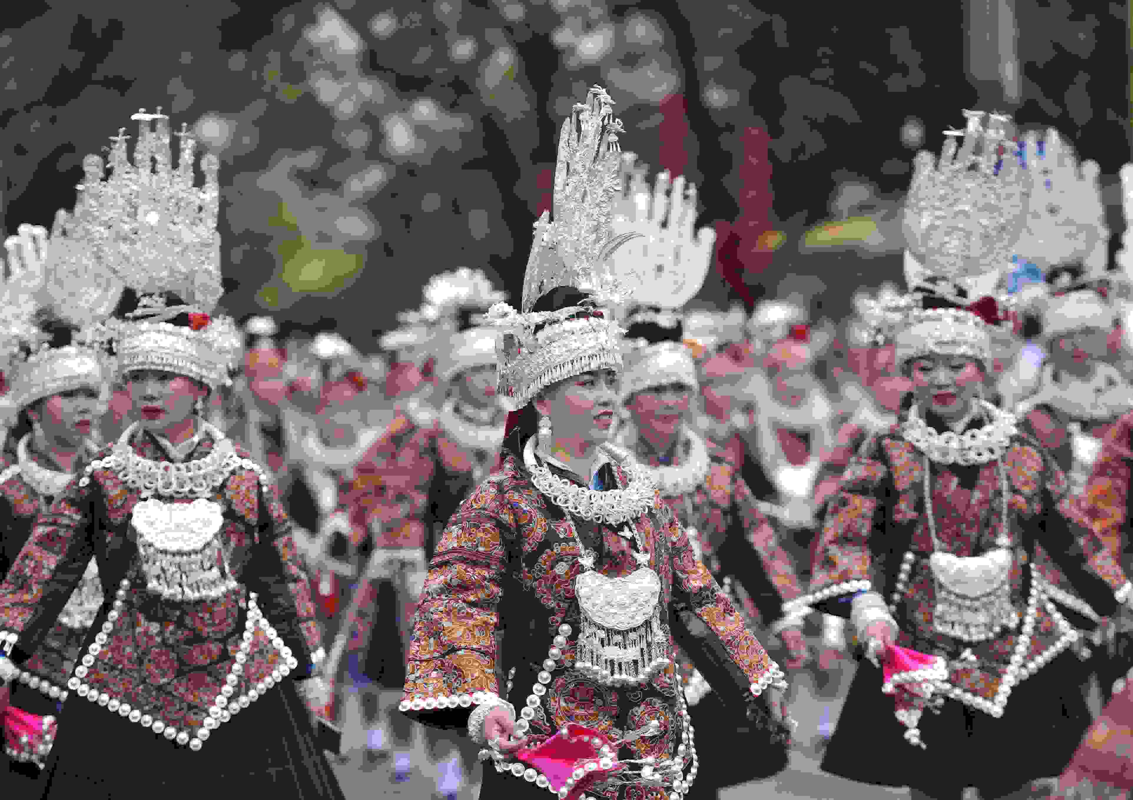 2023年5月2日,貴州省臺(tái)江縣,苗族女子盛裝參加“姊妹節(jié)”游演。