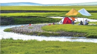 內(nèi)蒙古自治區(qū)錫林郭勒盟西烏珠穆沁旗綠草如茵,游客在河畔露營。新華社記者 彭 源攝