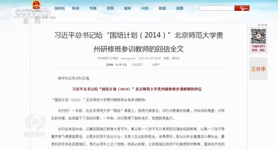 2014年9月,黃俊瓊和49名來(lái)自貴州的小學(xué)骨干語(yǔ)文教師到北京師范大學(xué)參加“中小學(xué)教師國(guó)家級(jí)培訓(xùn)計(jì)劃”,也就是“國(guó)培計(jì)劃”。培訓(xùn)期間,有件事讓她終身難忘。當(dāng)時(shí),習(xí)近平總書(shū)記到北京師范大學(xué)考察,專門和他們進(jìn)行了座談。