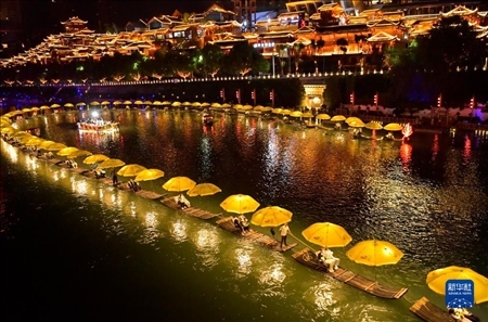 5月1日晚,游客在湖北省宣恩縣貢水河上乘坐竹筏欣賞夜色。