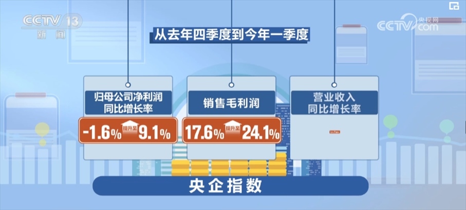 數(shù)據(jù)顯示,從去年四季度到今年一季度,央企指數(shù)歸母公司凈利潤(rùn)同比增長(zhǎng)率由-1.6%提升至9.1%,銷售毛利潤(rùn)由17.6%提升至24.1%,營(yíng)業(yè)收入同比增長(zhǎng)率由1.1%提升至5.4%。相比去年四季度,各項(xiàng)財(cái)務(wù)指標(biāo)均有不同程度提高。