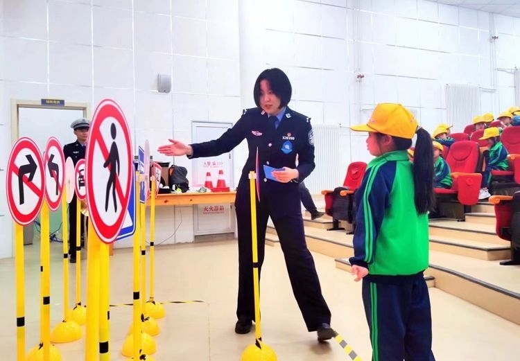 學(xué)警教同學(xué)識別交通道路標(biāo)志牌。