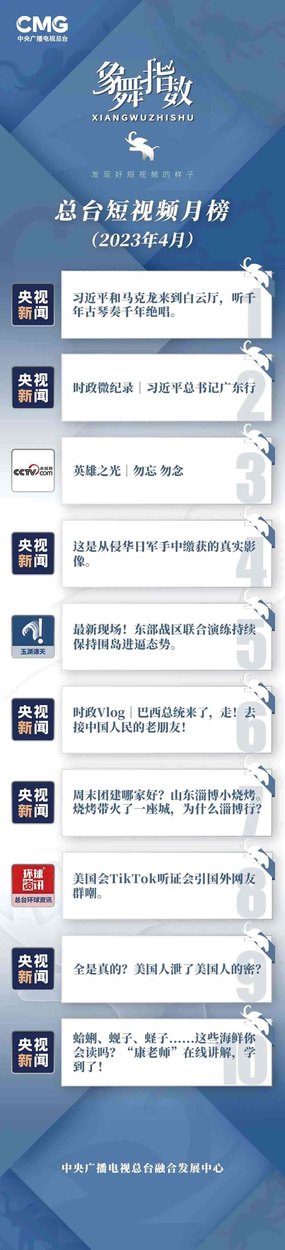 中央廣播電視總臺“象舞指數(shù)”評議品牌,推出主流媒體短視頻月榜、總臺短視頻月榜。在2023年4月,這些內(nèi)容引發(fā)大眾關(guān)注: