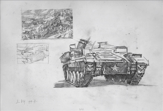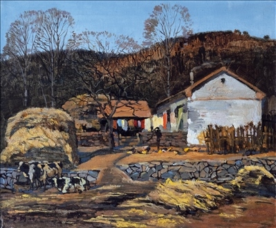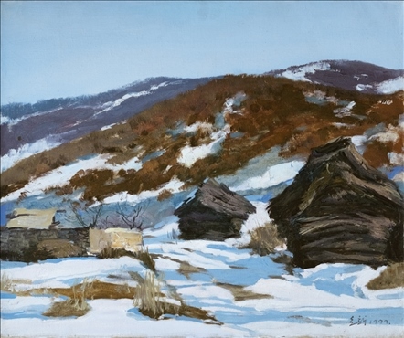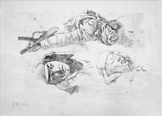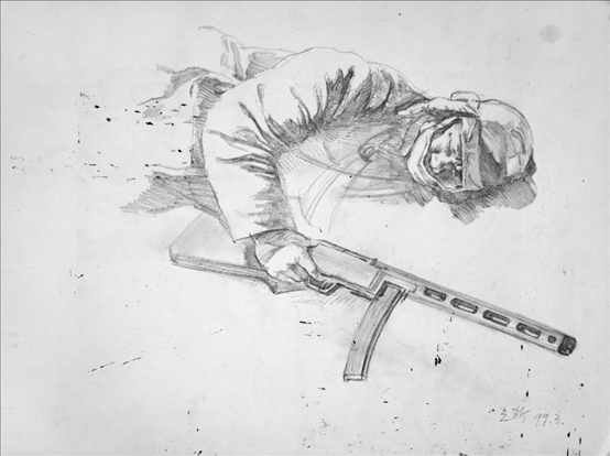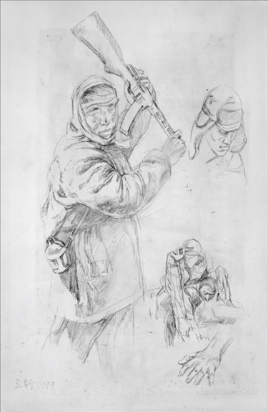 《激戰(zhàn)松骨峰》描繪的是抗美援朝戰(zhàn)爭中,中國人民志愿軍與美軍激烈廝殺的悲壯場面。作者從動態(tài)型的構圖與形象表層,把戰(zhàn)爭集團之間的搏殺以濃重的筆調展現(xiàn)開來,表現(xiàn)了中國人民志愿軍英勇頑強、熱愛自由和勇于犧牲的精神,展示了歷史的悲劇性沖突。作者從沉甸甸的歷史中找到戰(zhàn)爭中最慘烈、最殘酷、最能表現(xiàn)人物悲劇性命運的瞬間,用現(xiàn)實主義的創(chuàng)作手法,扎實、生動地塑造了一個又一個志愿軍勇士的形象。硝煙籠罩著戰(zhàn)場,鮮血與白雪融合成冰,敵我雙方,犬牙交錯,生死搏殺。同時,也使我們感受到戰(zhàn)爭的殘酷與生命的脆弱。作者處理宏大的戰(zhàn)爭場面獨具匠心:陽光透過硝煙,有節(jié)奏地營造出戰(zhàn)場的空間;雪地上被間隔的藍色陰影,反襯出黃褐色的主調。作品對細部進行了恰如其分的刻畫,但又不失對整體宏觀的把握,厚重的色彩中透出熱情,樸拙的筆觸映著畫家的激動。