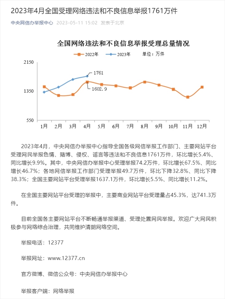 央視網(wǎng)消息:據(jù)中央網(wǎng)信辦舉報(bào)中心,2023年4月,中央網(wǎng)信辦舉報(bào)中心指導(dǎo)全國(guó)各級(jí)網(wǎng)信舉報(bào)工作部門、主要網(wǎng)站平臺(tái)受理網(wǎng)民舉報(bào)色情、賭博、侵權(quán)、謠言等違法和不良信息1761萬(wàn)件,環(huán)比增長(zhǎng)5.4%、同比增長(zhǎng)9.9%。其中,中央網(wǎng)信辦舉報(bào)中心受理舉報(bào)74.2萬(wàn)件,環(huán)比增長(zhǎng)67.5%、同比增長(zhǎng)46.7%;各地網(wǎng)信舉報(bào)工作部門受理舉報(bào)49.7萬(wàn)件,環(huán)比下降32.8%、同比下降38.3%;全國(guó)主要網(wǎng)站平臺(tái)受理舉報(bào)1637.1萬(wàn)件,環(huán)比增長(zhǎng)5.5%、同比增長(zhǎng)11.2%。