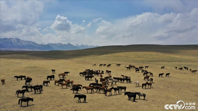 甘肅張掖,初夏時(shí)節(jié),位于祁連山下的山丹馬場積雪消融,草原開始泛綠,成群的馬匹正在吃草,一派生機(jī)勃勃的景象。