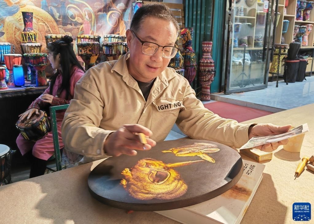 5月10日,工藝美術師申洪杰在敦煌夜市進行敦煌木刻畫創(chuàng)作展示(手機照片)。