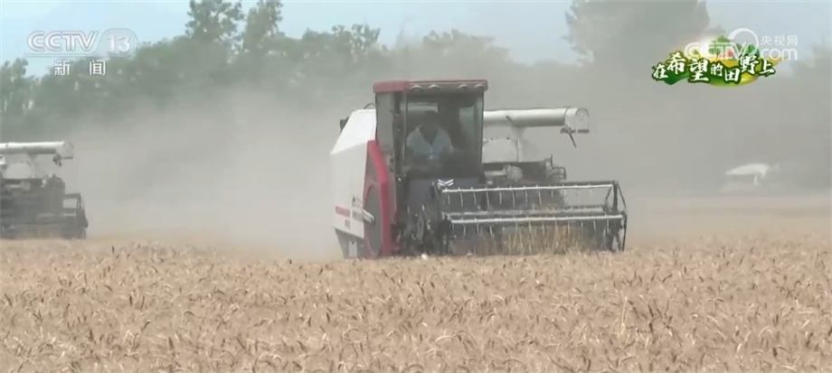 總臺記者 趙雄:歡迎大家跟隨我們的鏡頭一起走進(jìn)成都平原,來感受豐收的喜悅。我現(xiàn)在所在的位置是四川邛崍市的萬畝糧油示范基地。在我身后,200多畝成片的小麥已經(jīng)成熟,放眼望去,金黃的麥穗在風(fēng)中搖曳,麥浪翻滾煞是喜人。在麥田上,我們可以看到多臺大型收割機(jī)來回穿梭作業(yè),一簇簇麥穗被卷入收割機(jī)倉,收割、脫粒、除雜一氣呵成,金色麥粒傾瀉入倉。