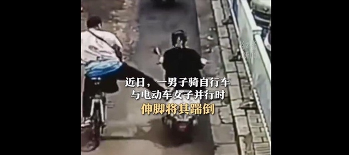 ·一男子騎自行車與一騎電動車女子并行時伸腳將其踹倒。街道辦回應(yīng):事發(fā)后當(dāng)?shù)嘏沙鏊槿胝{(diào)查,當(dāng)事雙方已和解。