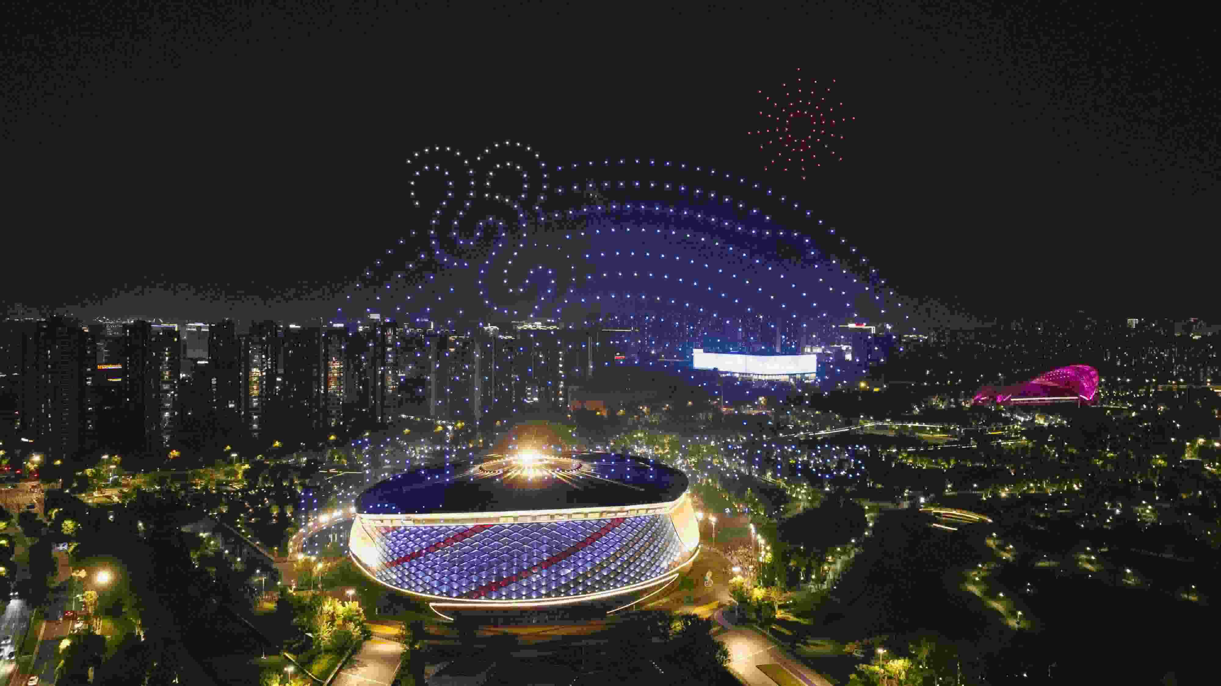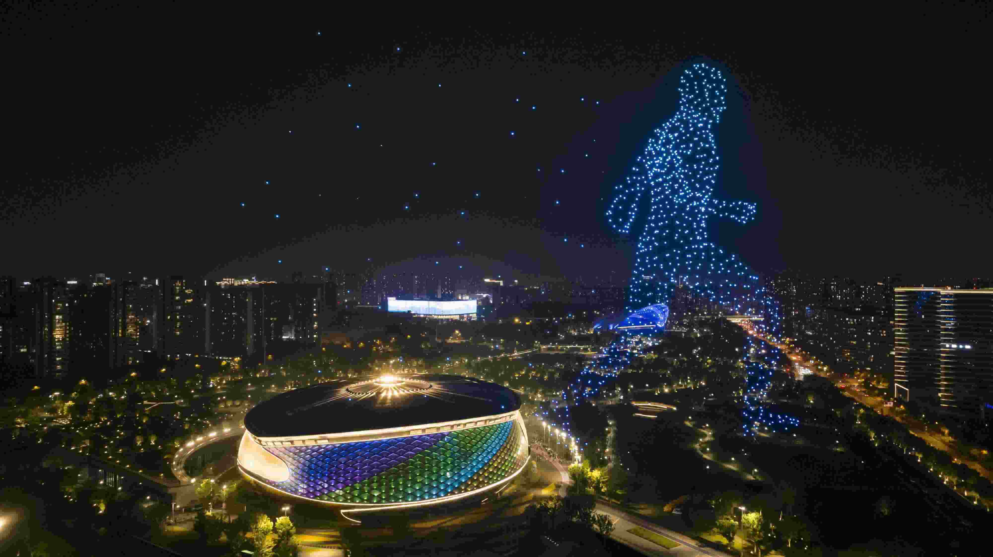 2023年5月13日,杭州亞運(yùn)會(huì)乒乓球比賽場地——拱墅運(yùn)河體育公園體育館上空上演無人機(jī)燈光秀表演。 視覺中國