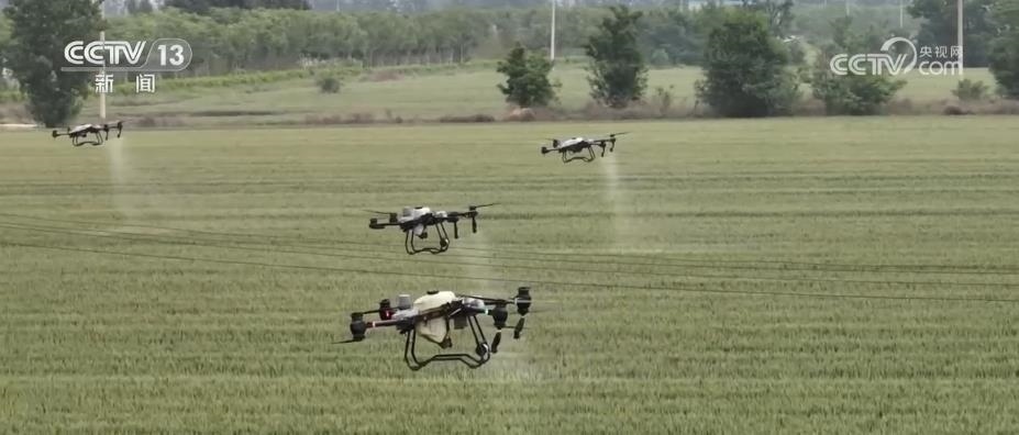 在山西運城,439萬畝小麥從北到南陸續(xù)進入揚花灌漿關(guān)鍵期,農(nóng)技人員在田間地頭給予農(nóng)戶技術(shù)指導(dǎo)。在運城河津市村民馬關(guān)發(fā)的小麥田里,10架無人機正在麥田上方進行噴灑作業(yè)。