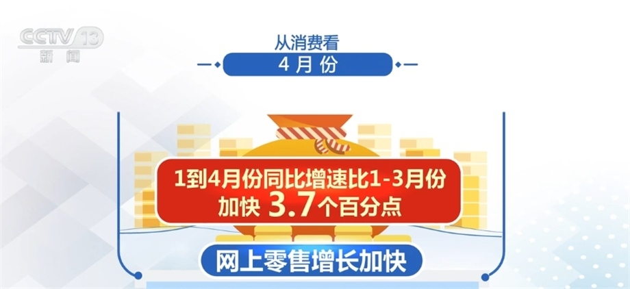 從消費看,4月份,社會消費品零售總額同比增長18.4%,比上月加快7.8個百分點。其中,網(wǎng)上零售增長加快,1—4月份同比增速比1—3月份加快3.7個百分點。