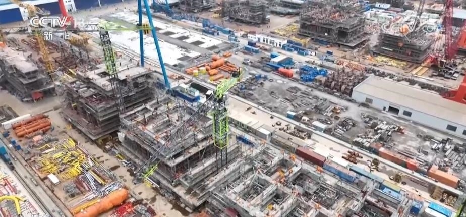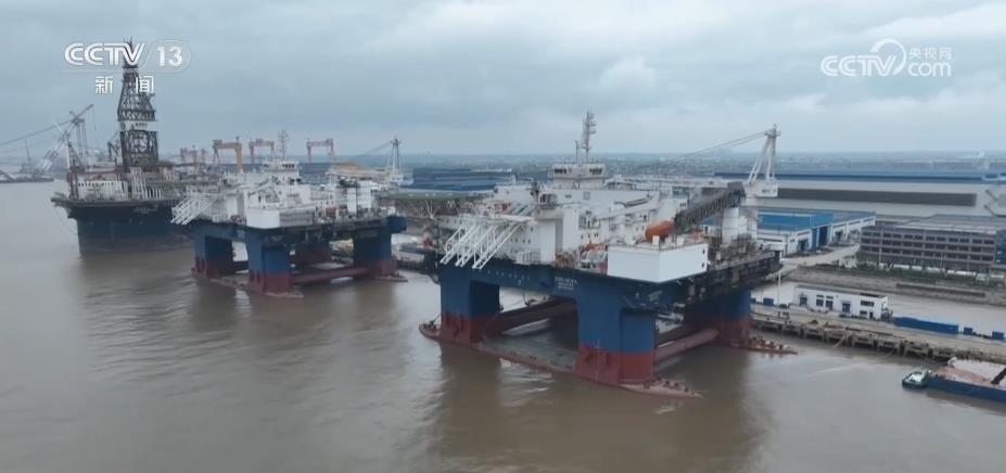 這些大家伙,都是世界技術(shù)比較領(lǐng)先的一些海工裝備。通過(guò)航拍的鏡頭,給大家展現(xiàn)一下,最遠(yuǎn)的是圓筒形超深水鉆探平臺(tái)。因?yàn)樗耐庑问仟?dú)特的圓筒型設(shè)計(jì),所以它的抗風(fēng)浪性、作業(yè)水深的能力非常得好,技術(shù)指標(biāo)創(chuàng)下多項(xiàng)世界第一。這家企業(yè),一共向國(guó)外交付了6艘同類型的產(chǎn)品。