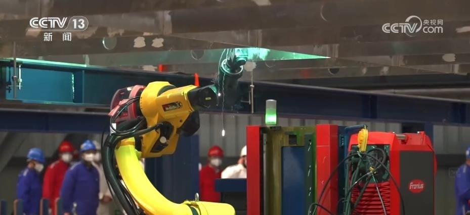 記者來(lái)到這個(gè)剛剛建成不久的智能化造船車間,一臺(tái)臺(tái)焊接機(jī)器人,正在自主完成作業(yè)。
