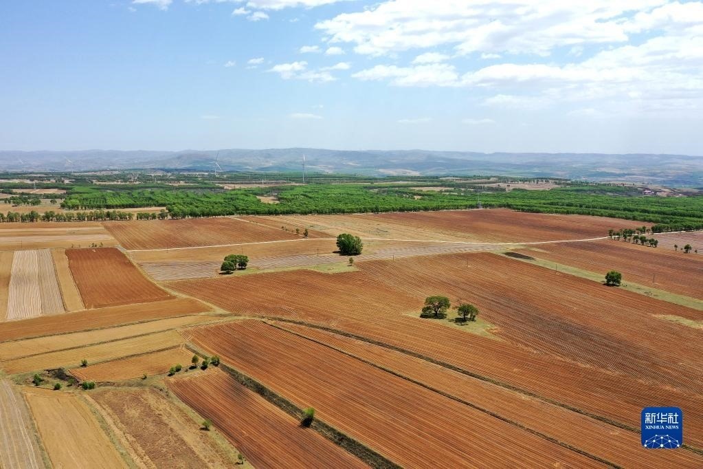 山西省右玉縣新城鎮(zhèn)田園景色(5月19日攝,無人機照片)。