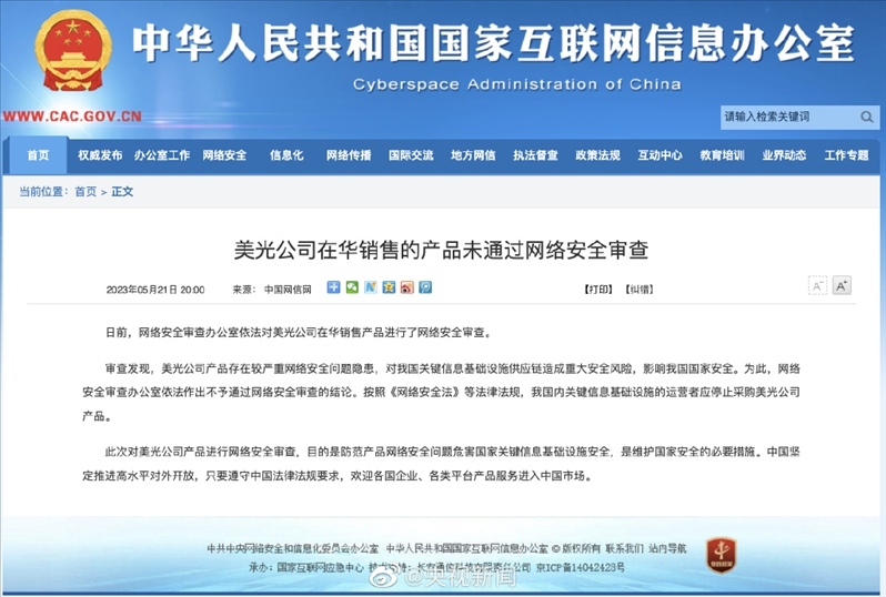 ·影響我國國家安全,美光公司在華銷售的產(chǎn)品未通過網(wǎng)絡安全審查。按照《網(wǎng)絡安全法》等法律法規(guī),我國內(nèi)關鍵信息基礎設施的運營者應停止采購美光公司產(chǎn)品。