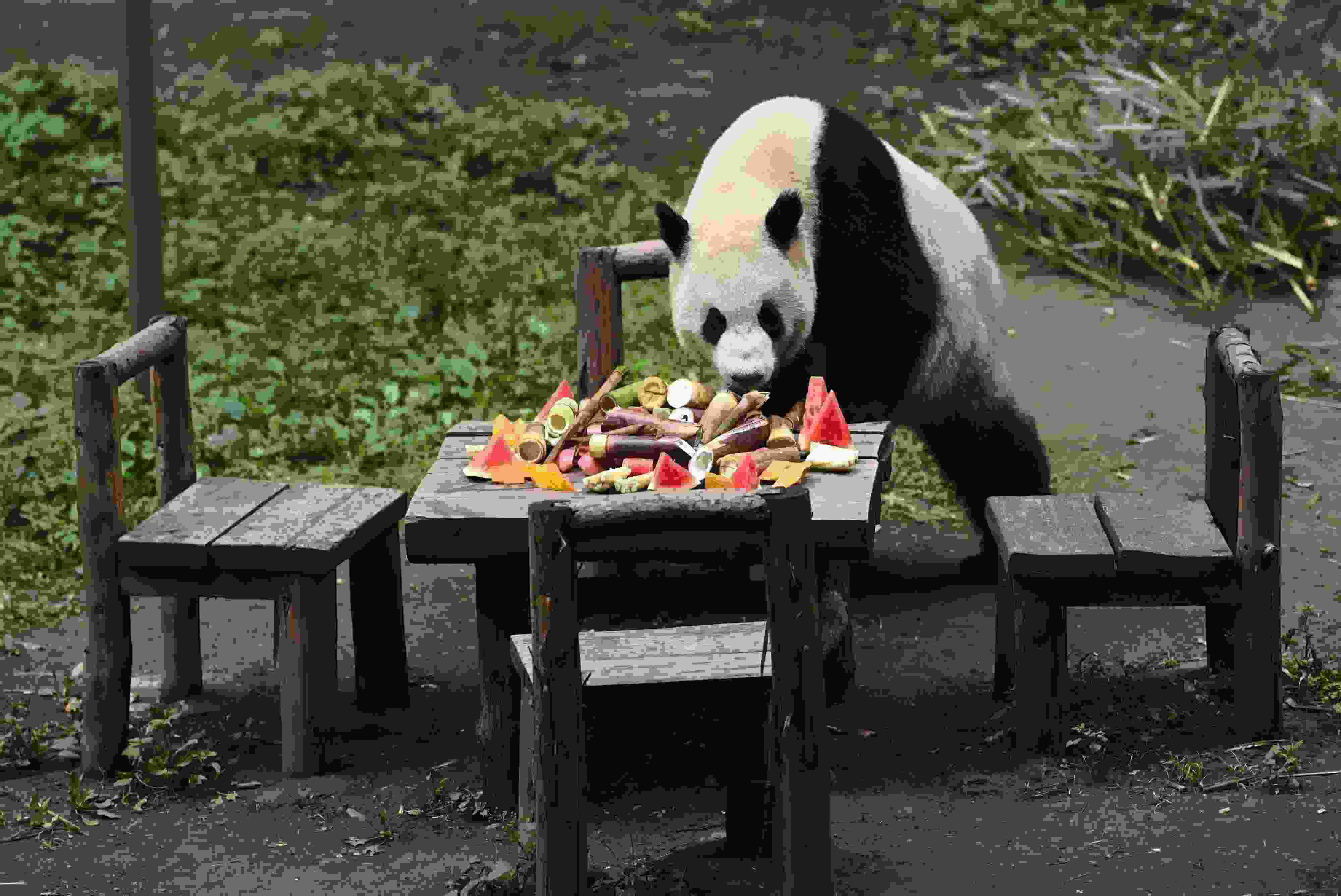2023年5月21日,在重慶動物園內(nèi),大熊貓在桌邊挑選美食,萌態(tài)十足。 視覺中國