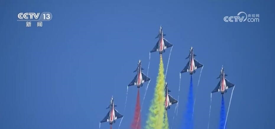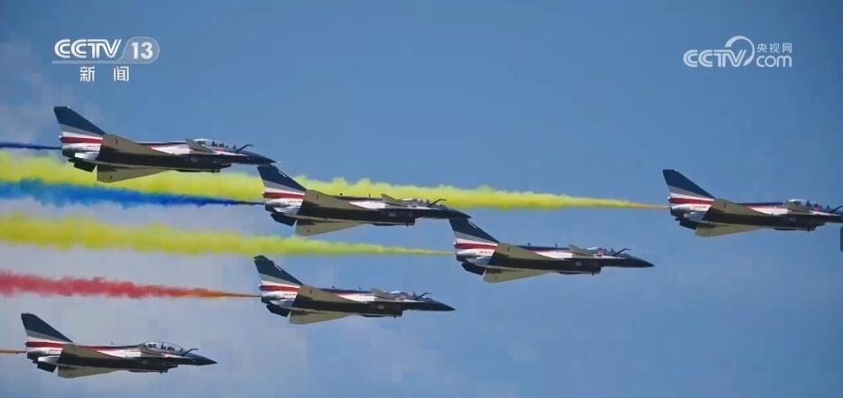 隨著滑出指令下達(dá),噴著五星紅旗涂裝的6架表演機(jī)緩緩駛向起飛線。6架表演機(jī)在云底高度1000米氣象條件下依次起飛,在空中迅速集結(jié)組成箭形編隊(duì)。以人字形編隊(duì)低空通場(chǎng),在空中以六道絢麗彩煙,以特殊禮儀向現(xiàn)場(chǎng)致以最崇高的敬意。