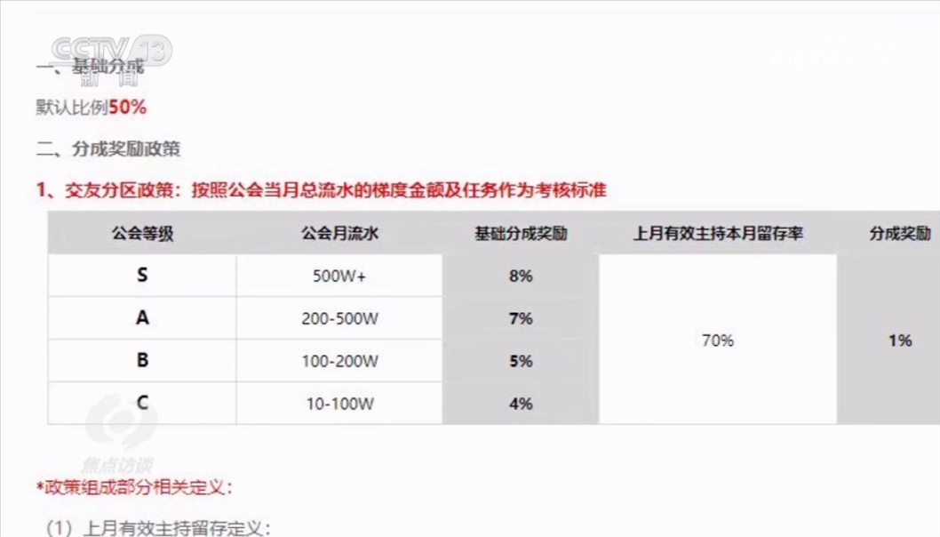主播得到的打賞,平臺和經(jīng)紀(jì)機(jī)構(gòu)都會(huì)參與分成。一般來說,平臺要首先分走50%的打賞費(fèi)用,剩下的由主播和經(jīng)紀(jì)機(jī)構(gòu)來分。從某平臺與主播經(jīng)紀(jì)公司的后臺約定中可以看出,當(dāng)月總流水的梯度金額及任務(wù)作為考核。經(jīng)紀(jì)機(jī)構(gòu)月流水超過500萬元,至少可以額外拿到8%的獎(jiǎng)勵(lì)。在這種制度的激勵(lì)下,就推動(dòng)經(jīng)紀(jì)公司和主播想方設(shè)法爭取更高額度的打賞。