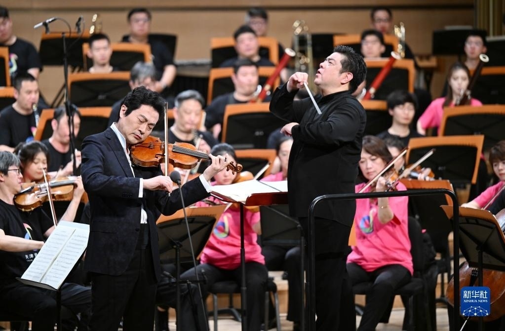 5月25日,在天津大劇院音樂廳,小提琴演奏家呂思清(左)和指揮李飚(右)在舞臺(tái)上演出。