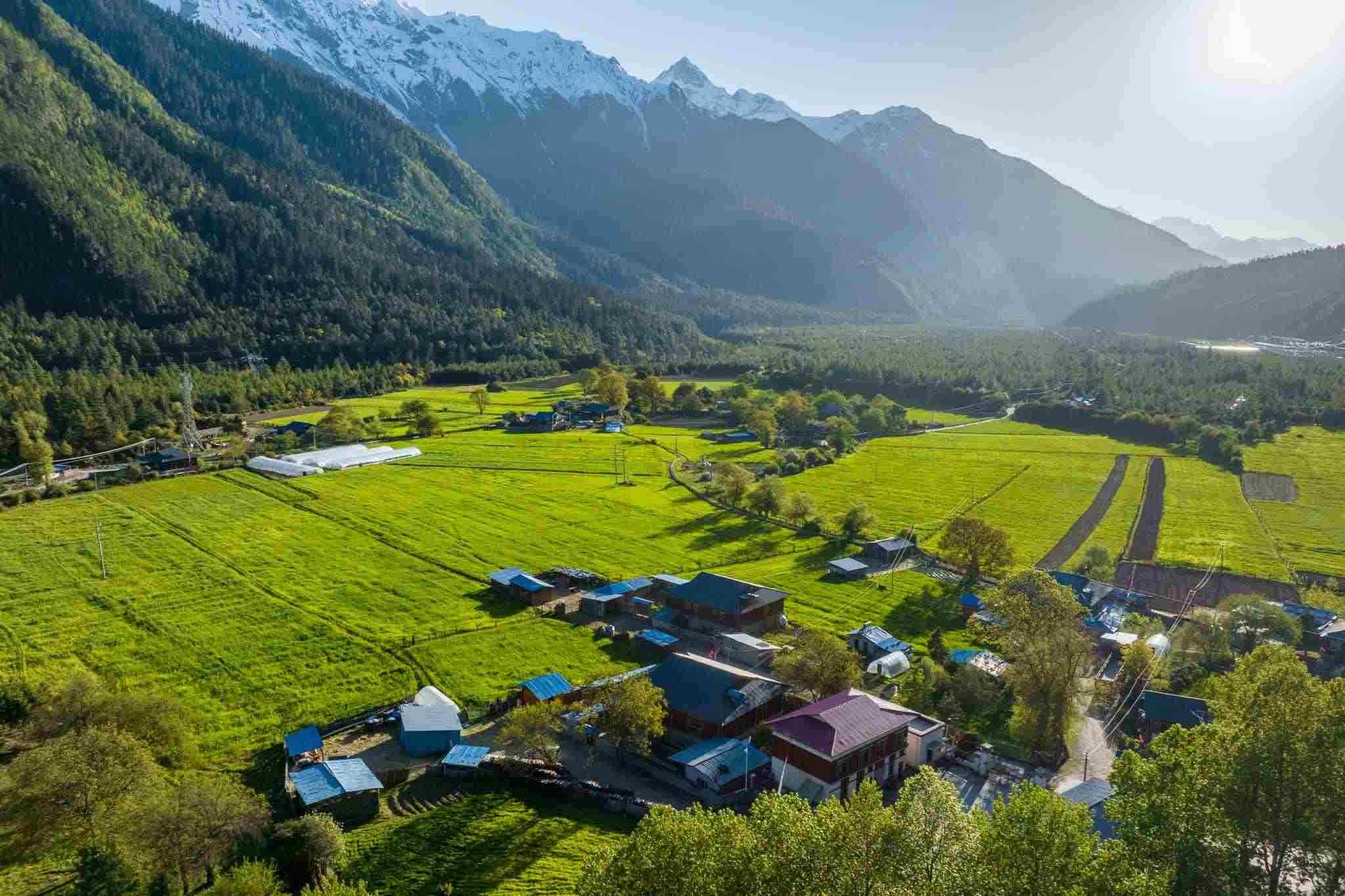 西藏林芝:村莊樹(shù)木茂密 遠(yuǎn)處雪山巍峨
