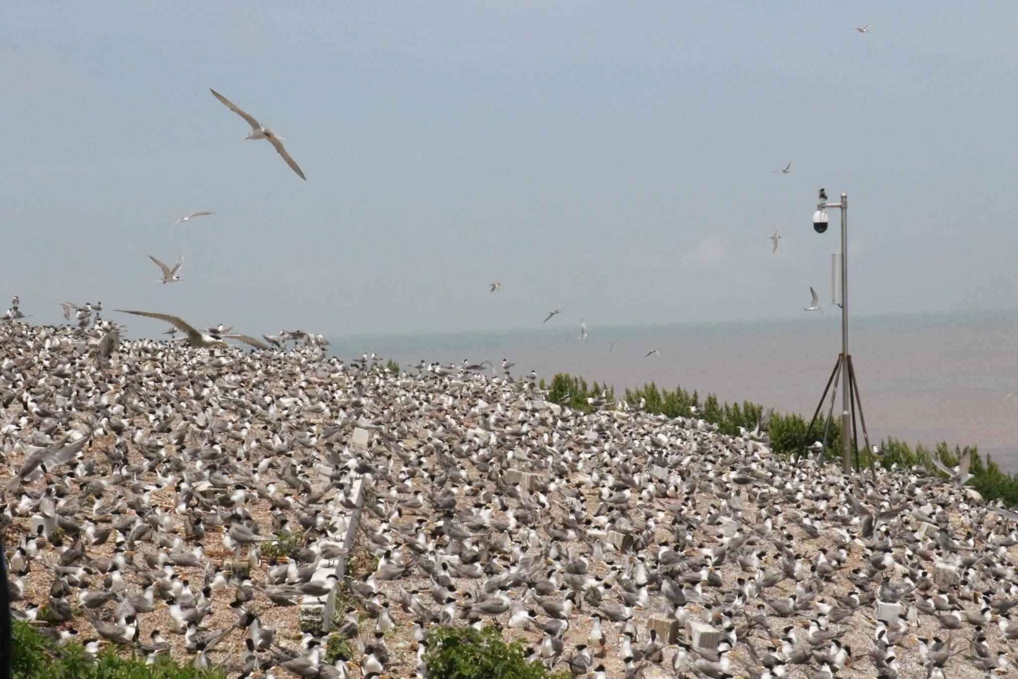 2023年5月25日,浙江寧波,數(shù)千只大鳳頭燕鷗和數(shù)十只中華鳳頭燕鷗在鳥島棲息。中華鳳頭燕鷗是極度瀕危物種,被稱為“神話之鳥”。視覺中國