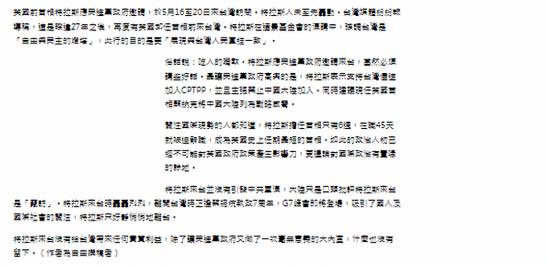 這兩天,譚主發(fā)現(xiàn)臺灣中時新聞網(wǎng)刊發(fā)了一篇快評文章:《特拉斯悄悄走了》。文章說到:特拉斯來臺沒有給臺灣帶來任何實質(zhì)利益,除了讓民進(jìn)黨當(dāng)局又做了一次毫無意義的大內(nèi)宣,什么也沒有留下。