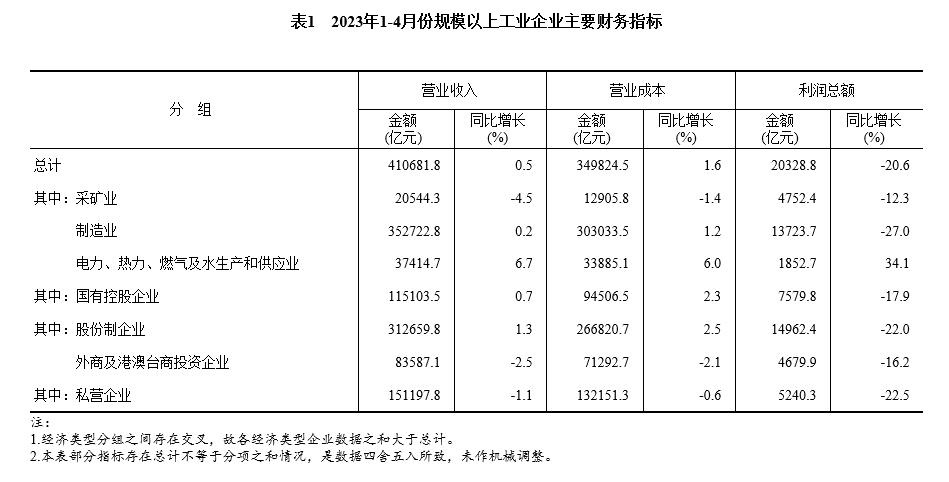 央視網(wǎng)消息:據(jù)國(guó)家統(tǒng)計(jì)局網(wǎng)站消息,1—4月份,全國(guó)規(guī)模以上工業(yè)企業(yè)實(shí)現(xiàn)利潤(rùn)總額20328.8億元,同比下降20.6%(按可比口徑計(jì)算,詳見(jiàn)附注二)。